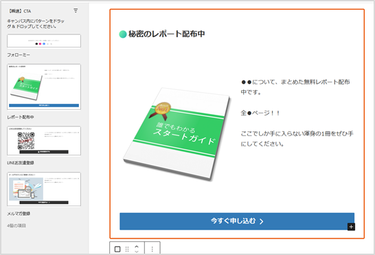 編集画面のパターンからすでにレイアウトが整ったパーツを選択して挿入できます。
