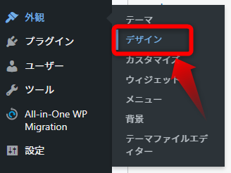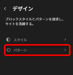 WordPressのダッシュボード「外観」→「デザイン」へ進みます。(テーマによっては「パターン」の場合もあります。)