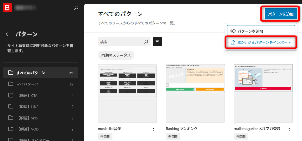 画面内の「パターンを追加」ボタンを押し、サブメニューの「JSONからパターンをインポート」に進みます。