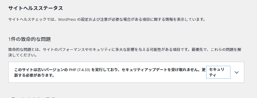 WordPressのダッシュボード→ツール→サイトヘルスでも「致命的な問題」と出ているはずです。