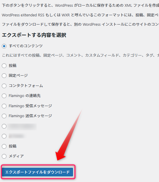 基本「すべてのコンテンツ」で良いですが、バックアップする項目にチェックをいれて「エクスポートファイルをダウンロード」ボタンを押すと、バックアップデータがダウンロードできます。PCの任意の場所に保存してください。