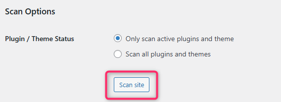 現在有効化されているプラグイン&テーマだけチェックするか、すべてのプラグインとテーマをチェックするか選択できますので、どちらか選択した上「Scan site」ボタンを押します。