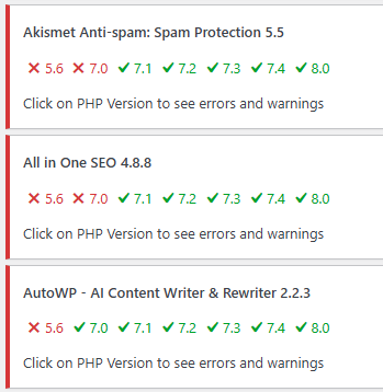ただ、この結果は目安で、例えば5.6~8.0まで全部非対応と出た場合(つまり真っ赤)の場合は“プラグイン配信元が情報を更新していないまたは提供していない”可能性もあるので、ここで「8.0未対応」となっていても実際には問題ない場合もあります。