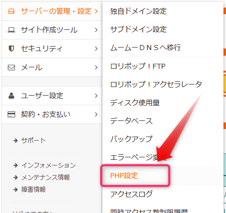 サイドメニューの「サーバーの管理・設定」のサブメニューから「PHP設定」を選択します